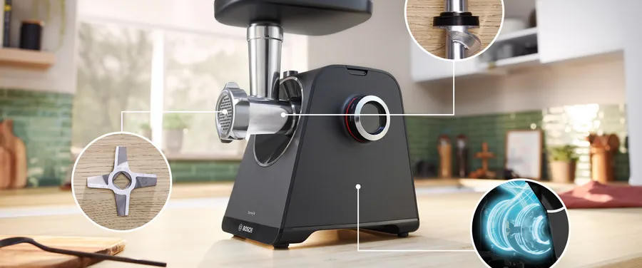 Мясорубка Bosch MFWS450B выполнена из прочного пластика, что делает прибор стильным и практичным элементом кухонного пространства. Небольшие размеры (24.7 х 20 х 24 см) и вес 4.9 кг облегчают размещение на рабочей поверхности и хранение, а прорезиненные ножки обеспечивают устойчивость при интенсивной эксплуатации. Модель из серии MultiPower Series 4 сочетает аккуратный внешний вид с функциональной компоновкой: загрузочный лоток пластиковый, удобной конфигурации, позволяет быстро подавать куски продукта к механизму, а универсальный толкатель повышает безопасность и эффективность работы. В корпус встроены отсеки для хранения насадок и для сетевого шнура, что сохраняет порядок и сокращает время подготовки к использованию.