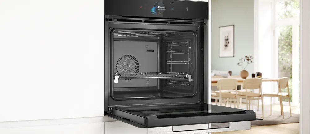 Для тех, кто ценит точность результата, предусмотрены многоточечный термощуп PerfectRoast и сенсор для выпечки PerfectBake; оба инструмента автоматически подстраивают процесс, обеспечивая равномерность прожарки и идеальную структуру изделий из теста. Меню Assist предлагает готовые сценарии приготовления, а автоматический быстрый разогрев экономит время перед стартом процесса. Телескопические направляющие на одном уровне гарантируют комфортную загрузку и безопасное вынимание емкостей, а внутреннее LED-освещение делает контроль визуально удобным. Дверца с откидыванием оснащена амортизатором SoftOpen для плавного закрывания и имеет трехслойное остекление, повышающее теплоизоляцию и безопасность. Задняя стенка покрыта панелями EcoClean, уменьшающими степень загрязнений и упрощающими обслуживание при традиционной очистке камеры. Наличие встроенной блокировки для детей и современной системы охлаждения корпуса повышает уровень безопасности в быту.