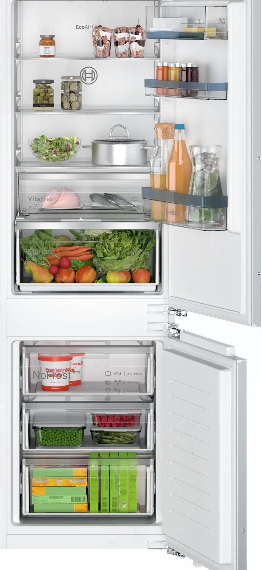Встраиваемый двухкамерный холодильник Bosch KIN86VFE0 - это высококачественная техника, произведенная в Евросоюзе, которая сочетает в себе функциональность и стильный дизайн. Белый цвет корпуса придаёт ему элегантность и позволяет гармонично вписаться в любой интерьер кухни. Модель оснащена двумя камерами - холодильной и морозильной, расположенной снизу, общим полезным объемом 260 литров, что делает ее идеальным выбором для средних и больших семей.