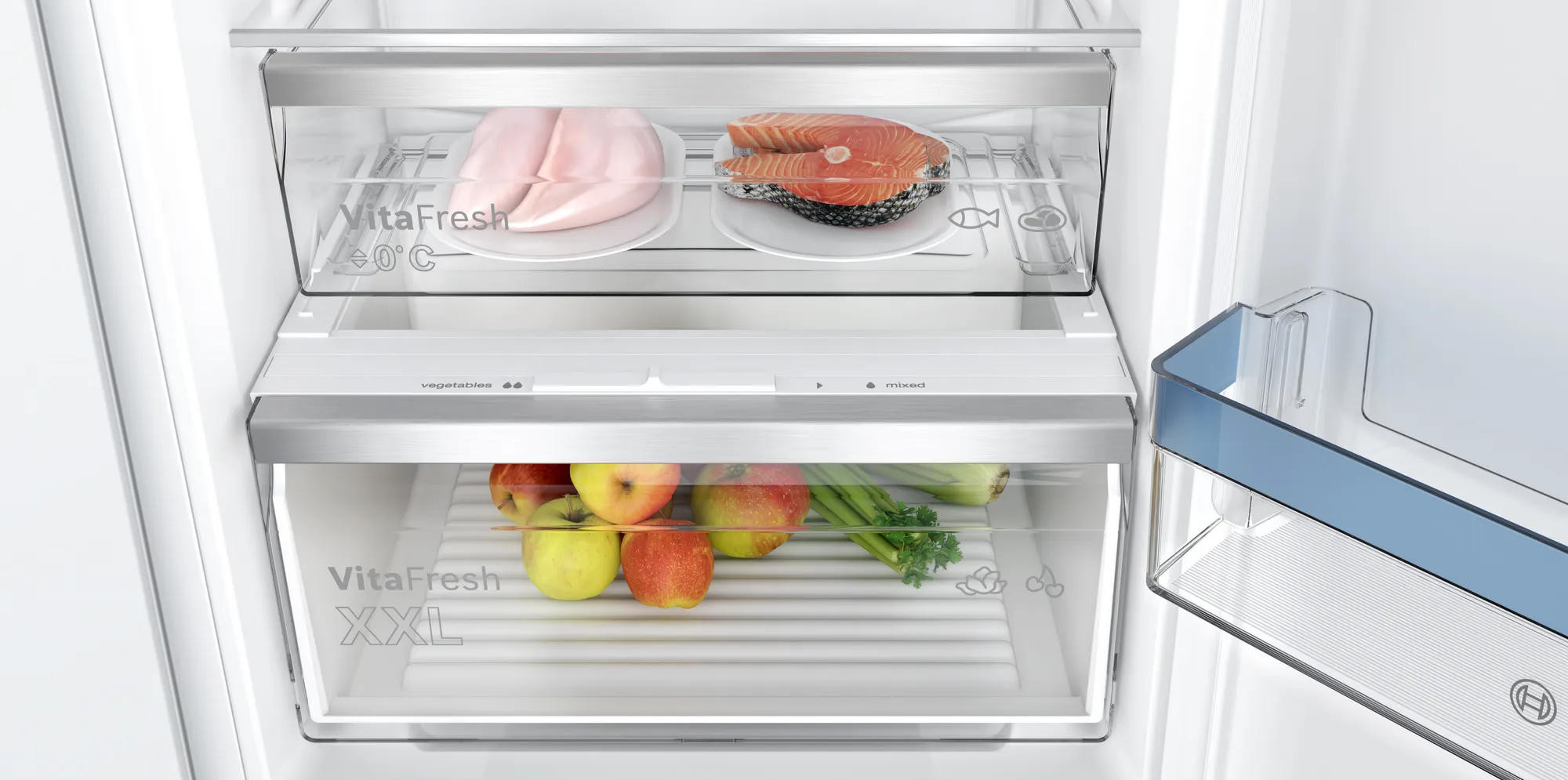 Внутреннее пространство холодильника продумано до мелочей. В холодильной камере 4 полки из высокопрочного стекла, 3 из которых регулируемые, и специальная полка для бутылок. Также есть 3 полки на дверце и 3 подставки для яиц. Светодиодное освещение обеспечивает яркий и равномерный свет. Зона свежести VitaFresh помогает сохранить продукты свежими на долгое время.