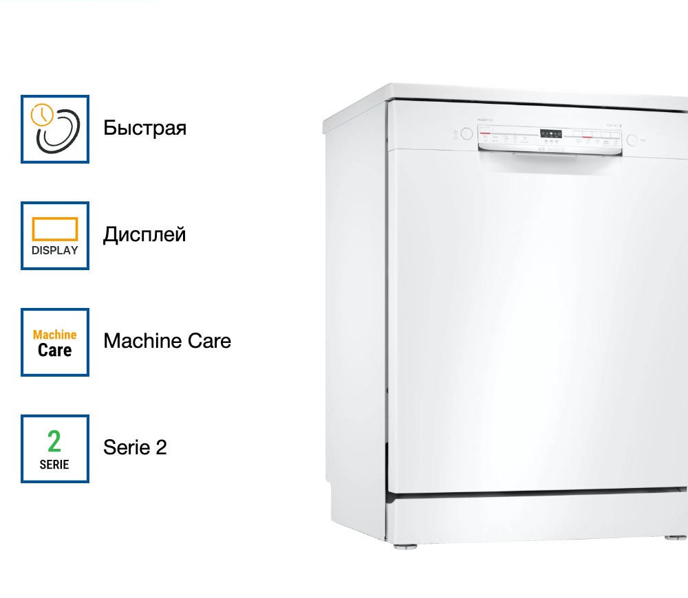 Посудомоечная машина Bosch SMS2ITW04E — отдельностоящий прибор, который выполнен в белом цвете с электронной панелью управления в виде кнопок и небольшого дисплея. Home Connect позволяет управлять устройством на расстоянии при помощи мобильного приложения. Функция ExtraDry поможет быстро высушить трудносохнущую посуду. Функция защиты стекла обеспечит бережную мойку стеклянной посуды и деликатных предметов.