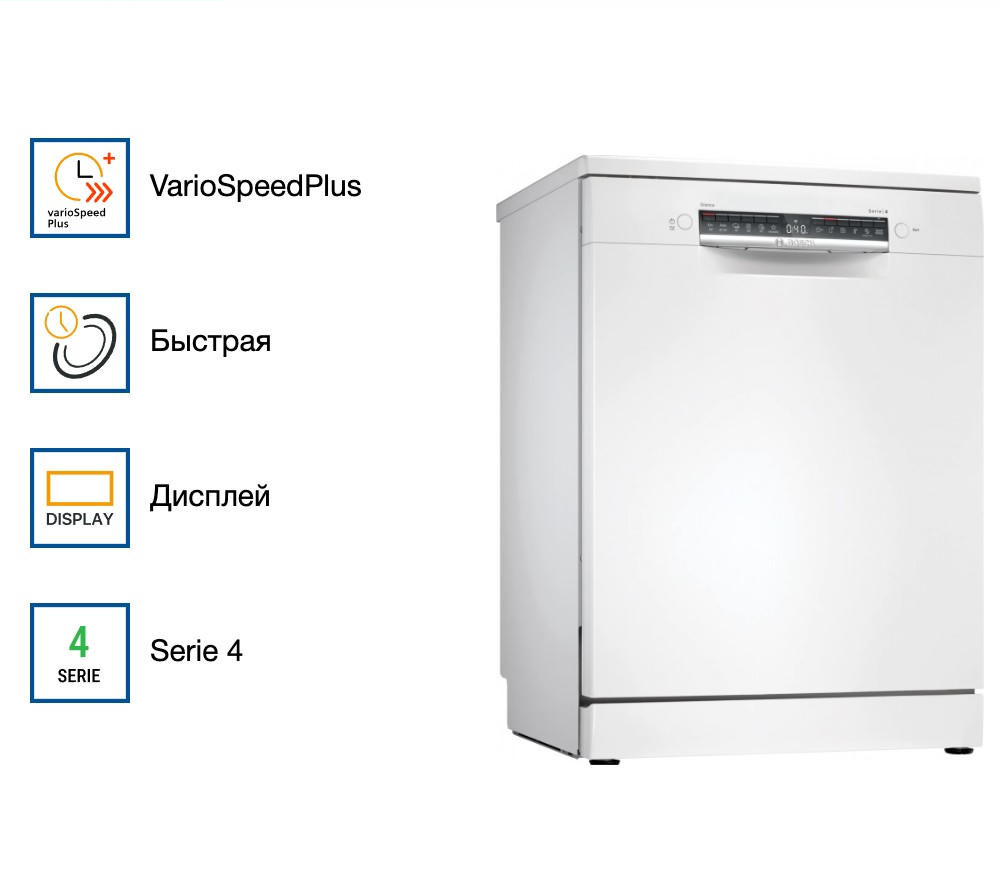 Посудомоечная машина Bosch SMS4IMW62Q — это отдельностоящая полноразмерная модель, которая сочетает в себе функциональность, стиль и надежность. Произведенная в Турции, эта машина обеспечивает гарантию на 12 месяцев, что подтверждает ее высокое качество и долговечность. Основной цвет машины — белый, что придает ей современный и элегантный вид, позволяя без труда вписаться в любой интерьер кухни. Машина оснащена инверторным двигателем EcoSilence Drive, который обеспечивает тихую и эффективную работу. Модель оборудована программами и температурными режимами, включая автоматическую, быструю, экономичную и интенсивную программы. Дополнительно предусмотрена. Посудомоечная машина Bosch SMS4IMW62Q оснащена нагревательным элементом проточного типа. Сенсор чистоты воды AquaSensor гарантирует эффективное и качественное мытье посуды. Панель управления машины закрытая, что обеспечивает удобство и безопасность использования. Дисплей и кнопки управления позволяют легко и быстро выбирать необходимые программы и настройки. Машина оснащена тремя корзинами для посуды и переставляемым по высоте верхним коробом с системой Rackmatic-3. Это обеспечивает гибкость и удобство при загрузке различной посуды. Система защиты от протечек обеспечивают безопасность эксплуатации машины. Блокировка от детей и встроенный предохранительный клапан являются дополнительными элементами безопасности. Материал внутреннего резервуара — нержавеющая сталь, что обеспечивает долговечность и устойчивость к коррозии. Машина имеет класс энергопотребления A++, что гарантирует экономичность и эффективность работы.