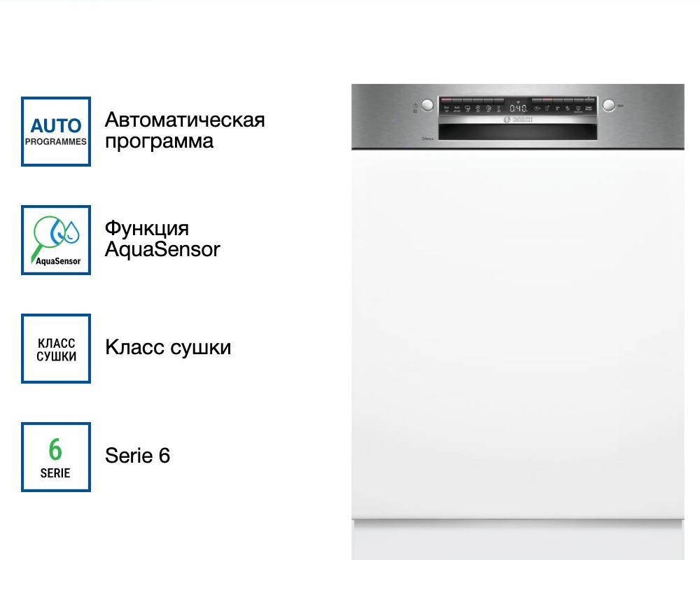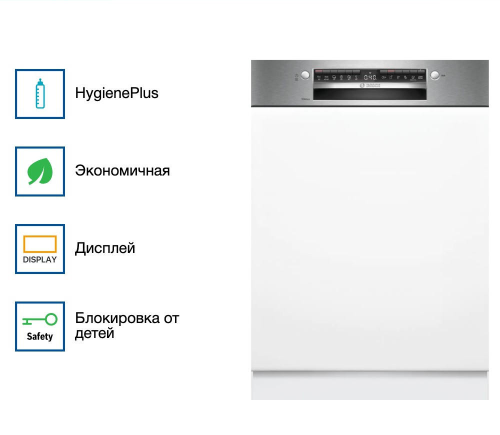 Также есть возможность удаленного запуска через приложение на смартфоне благодаря функции Home Connect. Индикаторы на панели информируют о наличии ополаскивателя и соли, а также о времени до окончания программы. Внутри машины три корзины для посуды, верхняя из которых переставляется по высоте для удобства размещения различных предметов. Блокировка от детей делают использование машины безопасным. Встроенный предохранительный клапан предотвращает возможные неполадки.