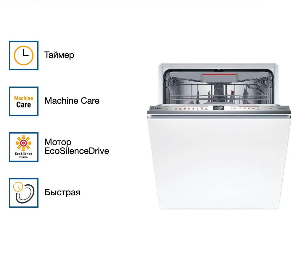 Экстра-сушка гарантирует идеально сухую посуду, а функция SpeedPerfectPlus сокращает время мойки без потери качества. Самоочистка фильтра и внутренняя подсветка облегчают уход за машиной.