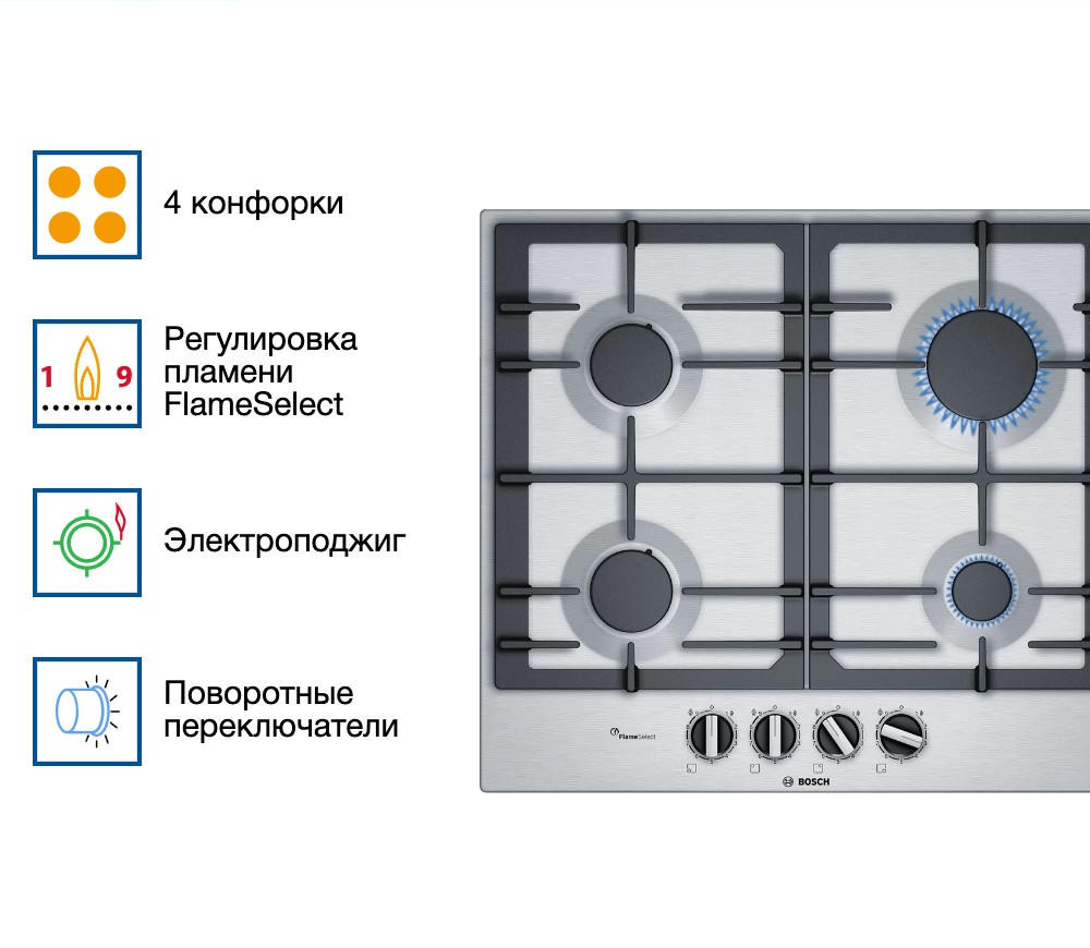 Варочная панель Bosch PCP6A5B90M выполнена из нержавеющей стали. Такой материал особенно устойчив к высоким температурам и моющим средствам. Он отличается долгим сроком эксплуатации. Открытый огонь не страшен ни Вам, ни вашей посуде — горелки надежно закрыты решетками. Чугунные решетки устойчивы к высоким температурам и долговечны. Они дополняют дизайн моделей, долго сохраняют свой внешний вид, безопасны при приготовлении, а также шероховатая поверхность не позволяет скользить посуде.