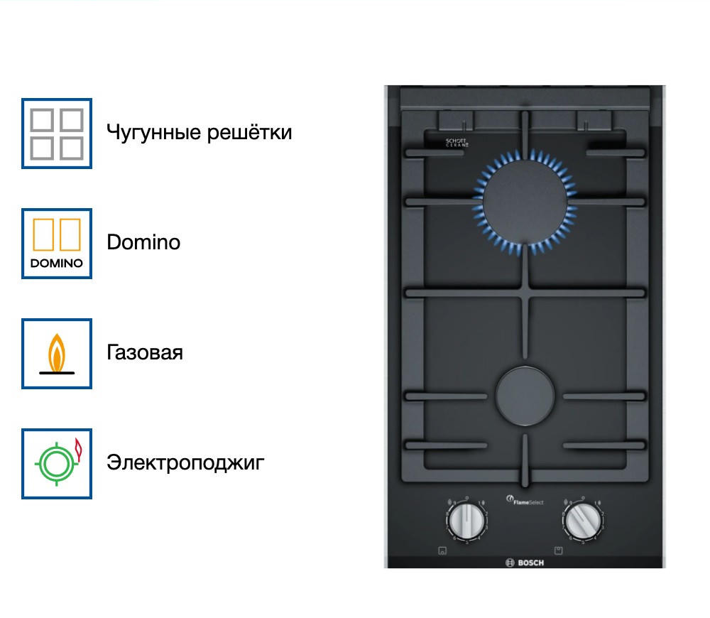 Варочная панель Bosch PRB3A6B70 представлена в черном цвете материал поверхности стеклокерамика. Имеется автоматический электроподжиг, он включается при повороте регулятора мощности. Есть защита при затухании пламя подача газа прекратится.