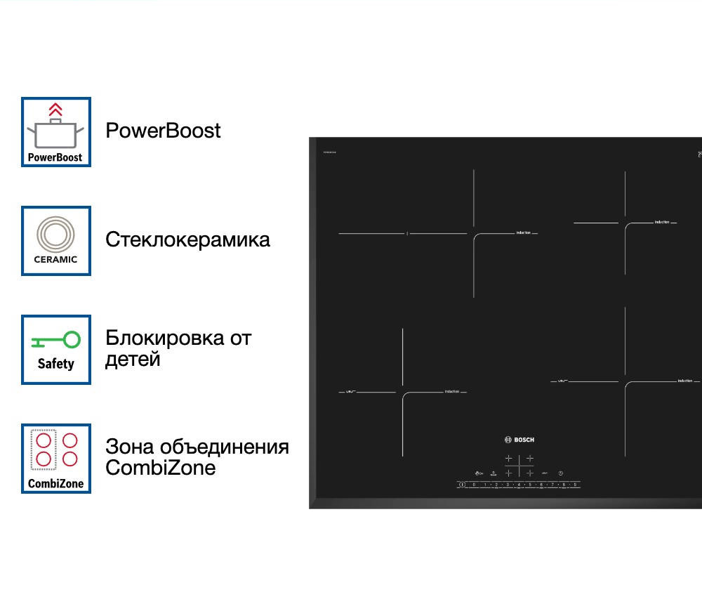 Варочная поверхность Bosch PIF651FC1E — это сочетание высоких технологий, элегантного дизайна и надежности. Произведенная в Евросоюзе, она обладает гарантией в 12 месяцев, что подтверждает ее высокое качество. Элегантная черная стеклокерамическая поверхность с скошенным краем не только выглядит стильно, но и обеспечивает удобство в использовании. Сенсорные элементы управления с системой DirectSelect позволяют легко и быстро выбрать необходимую мощность и время приготовления.