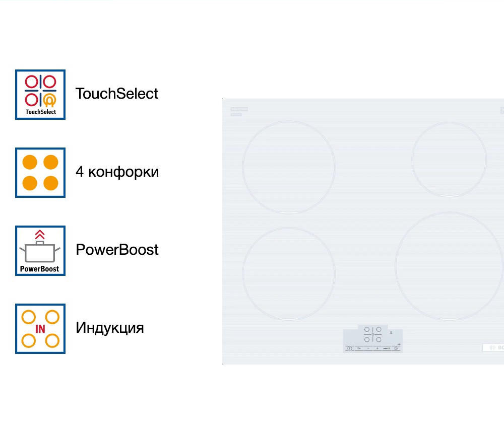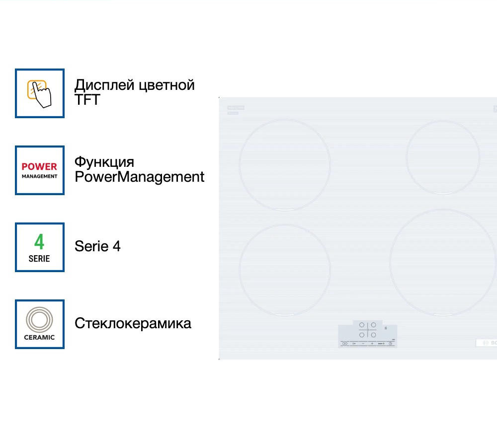 Индукционная варочная панель Bosch PUE612BB1J отличается своим уникальным дизайном и функциональностью. Основным материалом для этой модели является стеклокерамика, которая обладает высокой прочностью и устойчивостью к повреждениям. Белый цвет панели придает ей элегантность и изящество, делая ее центром притяжения внимания на кухне. Сенсорные элементы управления и TFT дисплей делают использование панели удобным и интуитивно понятным.