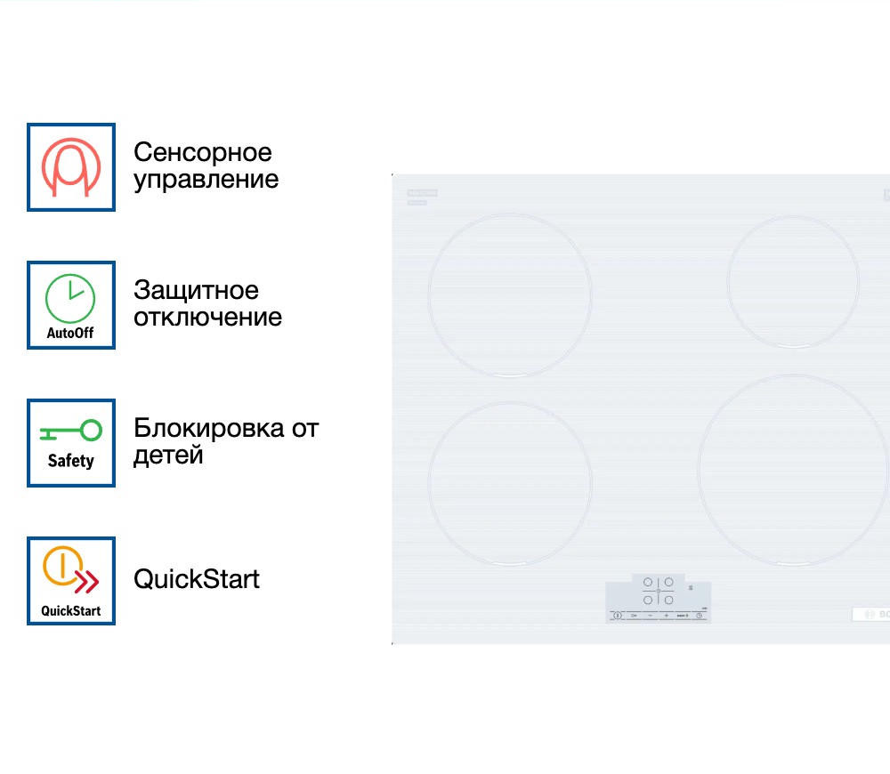 Панель оснащена четырьмя конфорками разного размера, что позволяет готовить разные блюда одновременно. Функция распознавания посуды автоматически определяет размер дна посуды и подстраивает под него зону нагрева, что позволяет экономить энергию и время при приготовлении пищи. Каждая конфорка оснащена таймером с функцией автоматического отключения, что предотвращает перегрев и пригорание пищи. Модель Bosch PUE612BB1J обладает рядом уникальных функций, которые делают процесс приготовления пищи еще более удобным и быстрым. Функция ReStart позволяет быстро возобновить работу панели после случайного отключения, а функция QuickStart автоматически устанавливает наиболее подходящий уровень нагрева для каждой конфорки. Функция PowerBoost значительно увеличивает мощность нагрева, что позволяет быстрее довести воду до кипения или приготовить блюдо. Варочная панель обладает системой защиты, которая включает главный выключатель, защитное отключение и блокировку от детей. Индикатор остаточного тепла предупреждает о том, что поверхность панели все еще горячая после использования. Минимальная толщина столешницы для установки этой модели составляет 16 мм, что делает ее универсальной для любого типа кухни.