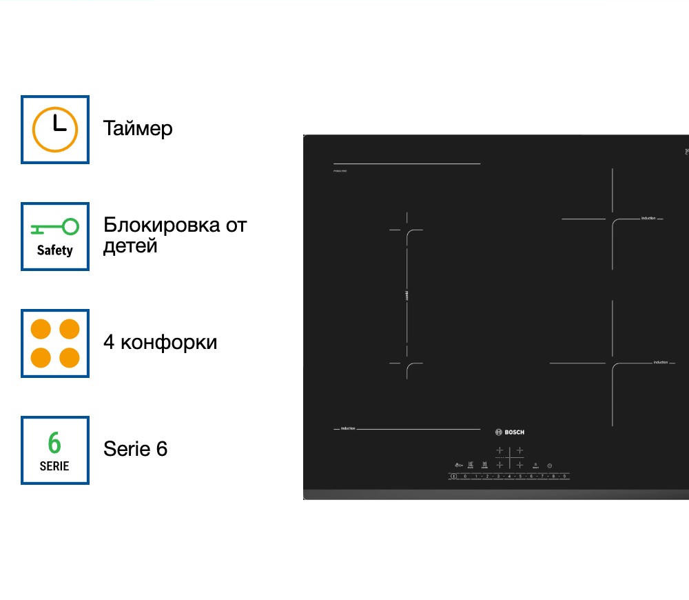 Варочная панель Bosch PVS631FB5E оснащена функцией PowerBoost, она повышает мощность нагрева до 50%, вы можете быстрее вскипятить воду. Таймер оснащен технологией отключения для каждой конфорки, можно выставить время для готовки. При выключении устройства, ваши настройки восстановятся при следующем запуске.