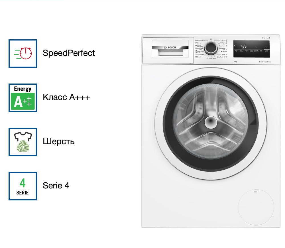 Барабан рассчитан на загрузку до 8 кг, что оптимально для семьи из 3-4 человек. Фронтальная загрузка обеспечивает удобство при закладке и извлечении вещей. За бесшумную и плавную работу отвечает инверторный мотор EcoSilenceDrive — он не только снижает уровень шума, но и увеличивает срок службы техники. Управление осуществляется через интуитивно понятную электронную панель с поворотным селектором и сенсорными элементами. Информативный LED-дисплей отображает текущий этап цикла, оставшееся время, рекомендованную загрузку и данные о работе системы SmartEcoControl, отвечающей за энергоэффективность.