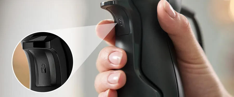 Особенностью данной модели является наличие 4-х лезвийного ножа QuattroBlade, который обеспечивает быстрое и равномерное измельчение продуктов. Блендер оснащен универсальной чашей с ножом для измельчения твердых продуктов, что делает его идеальным инструментом для приготовления разнообразных блюд. Кроме того, прибор имеет бесступенчатую регулировку скорости, что позволяет точно настраивать процесс измельчения в зависимости от конкретной задачи. Особое внимание заслуживает эргономичная ручка блендера, которая обеспечивает удобство и комфорт при использовании. Мерный стакан, входящий в комплект, позволяет легко измерять необходимое количество ингредиентов. Детали блендера можно легко снять и помыть в посудомоечной машине, что значительно упрощает процесс уборки после приготовления пищи.