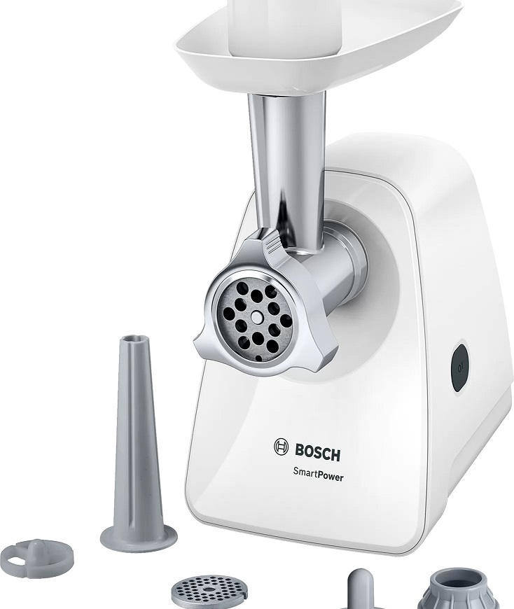 Мясорубка Bosch MFW2520W имеет высокую скорость приготовления фарша благодаря высокой мощности мотора — 1500 Вт (при блокировке мотора). Благодаря продуманной компактной конструкции не требует много места при хранении, это отличное решение для маленьких кухонь. Резиновые ножки для устойчивости на любой поверхности. В комплекте насадка для колбас.