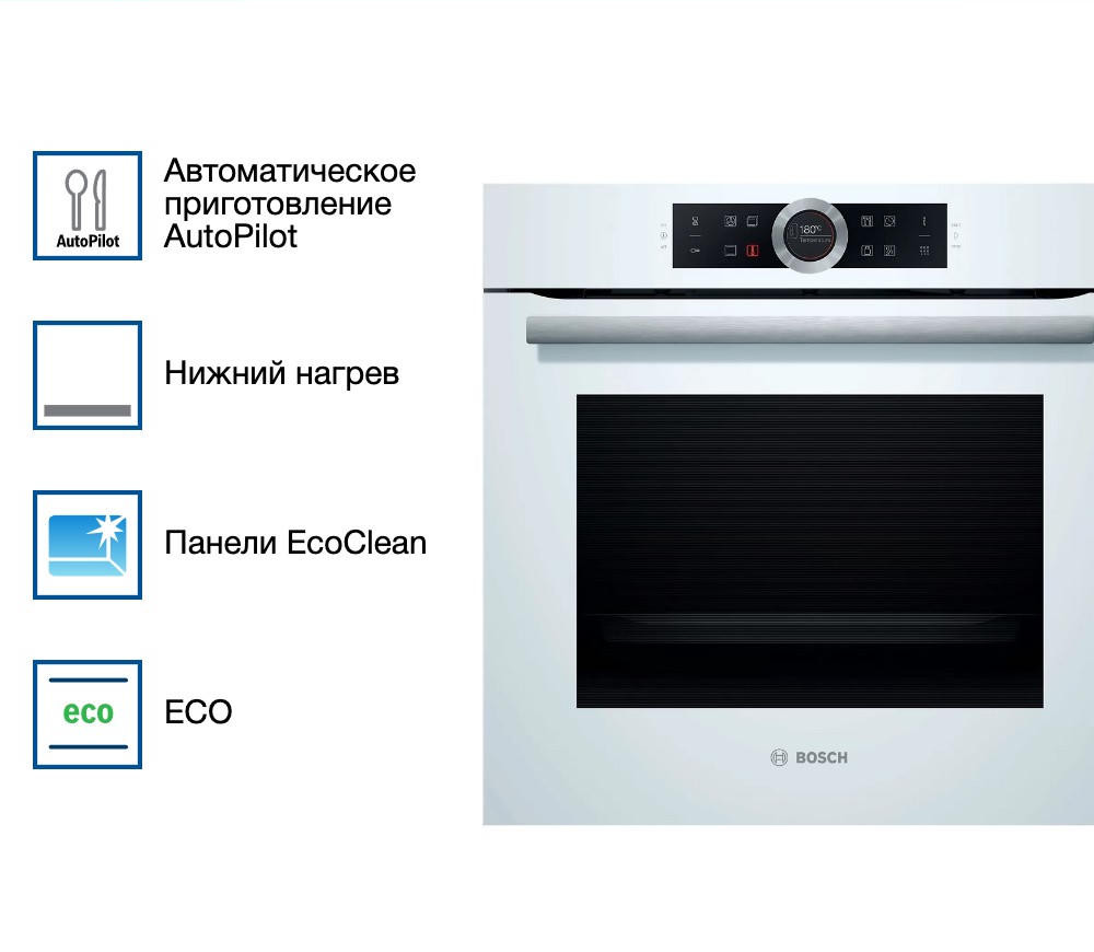 Духовой шкаф Bosch HBG675BW1 — это электрическая независимая модель из линейки Serie | 8. Ее внутренний объем составляет 71 литр, благодаря чему есть возможность запекать большие блюда. Она оформлена в белом цвете, благодаря чему отлично впишется в любой современный кухонный интерьер — например, в стиле хай-тек. Управление осуществляется посредством использования сенсорных кнопок и Control Ring.