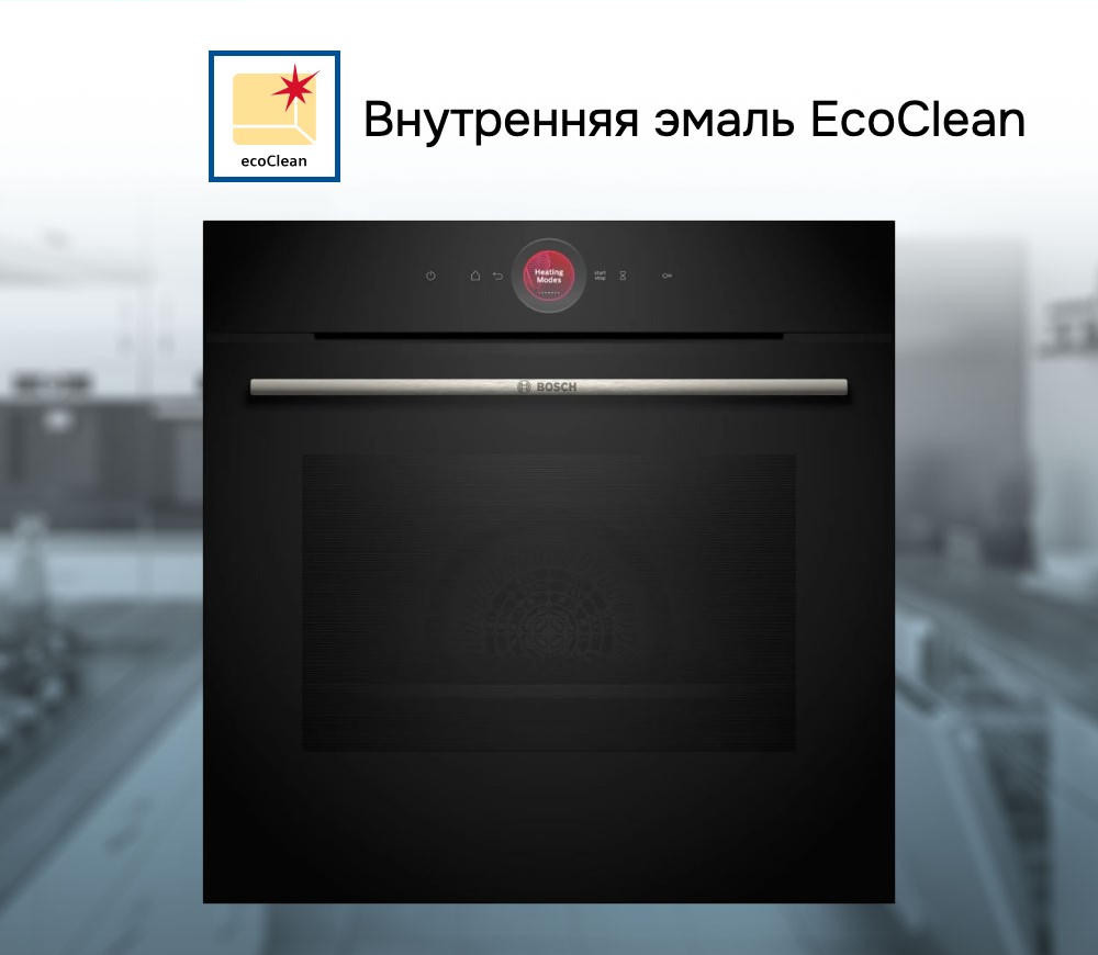Духовой шкаф оснащен функцией Home Connect, которая позволяет управлять им дистанционно с помощью смартфона или планшета. Всего доступно 14 режимов нагрева, включая 3D-горячий воздух, верхний/нижний жар, большой гриль, режим для пиццы и другие. Диапазон температур варьируется от 30 до 300 градусов, что позволяет готовить самые разные блюда. Внутренний объем духового шкафа составляет 71 литр, что позволяет готовить большие порции еды для всей семьи. Внутреннее освещение на основе галогеновых ламп обеспечивает хорошую видимость в процессе приготовления пищи. Дверца шкафа откидная, с амортизатором SoftOpen для мягкого и безопасного открытия. Очистка духового шкафа производится с помощью системы EcoClean. Это специальные панели, расположенные на задней стенке, которые абсорбируют и разрушают жир и остатки пищи при повышенной температуре. Благодаря этому, вам не придется тратить много времени и усилий на очистку духового шкафа.