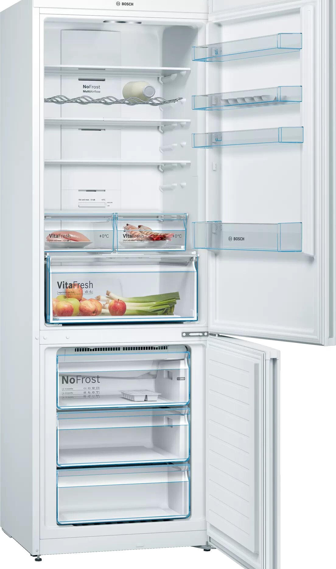 Двухкамерный холодильник Bosch KGN49XWEA имеет систему No Frost, она поддерживает постоянный поток сухого воздуха и предотвращает образование льда, вы можете забыть о размораживании холодильного и морозильного отделения. Выдвижная полка EasyAccess удобна, если холодильник полностью укомплектован. Имеется зона свежести прожуктов VitaFresh в ней удобно хранить свежую рыбу, мясо, овощи и фрукты до 0°C.