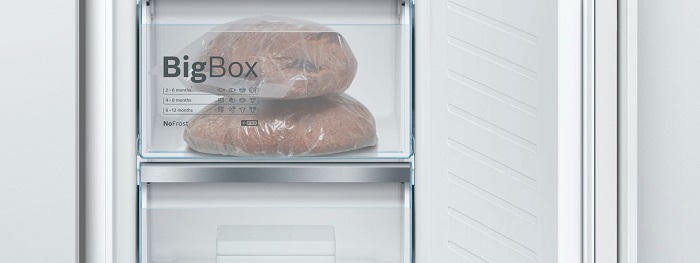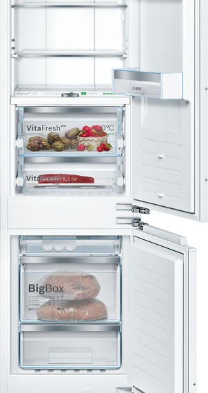 Двухкамерный холодильник Bosch KIF86HD20R — встраиваемая модель с зоной свежести с VitaFresh pro и системой охлаждения NoFrost. Морозильная камера расположена снизу, оснащена 3 ящиками для хранения продуктов, включая BigBox. Холодильное отделение укомплектовано 3 полками из закаленного стекла, 2 из которых можно переставлять по высоте, а также 2 зонами свежести VitaFreshPro и VitaFreshPro 0°C. Управление осуществляется непосредственно с помощью функции TouchControl и синхронизации с приложением Home Connect.