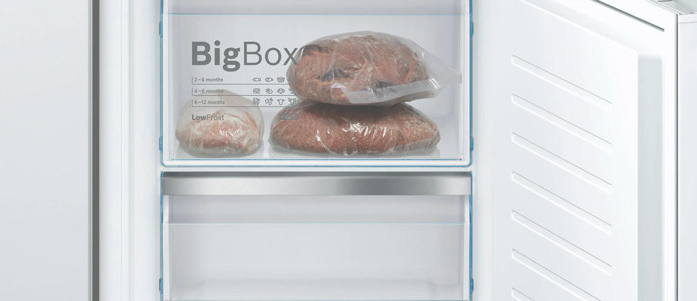 Морозильный отсек расположен внизу, что удобно для доступа к наиболее часто используемой холодильной части; внутри морозилки два ящика, один из которых большой BigBox для объемной упаковки. Наличие одной ванночки для льда позволяет быстро приготовить запас кубиков, а автоматические и звуковые индикации открытой двери и сигнализация об ошибке обеспечивают дополнительный контроль состояния прибора. Количество компрессоров одно и работает на двух контурах охлаждения, что повышает надежность и стабильность температур в каждой камере. Монтажный тип — жесткое крепление (система door on door) с возможностью перенавешивания двери и правым дверным упором, что обеспечивает гибкость при встраивании в кухонный гарнитур: рекомендуемый размер ниши для встраивания составляет 177.2–178 х 56 х 55–56 см. Размеры корпуса 177.2 х 55.8 х 54.5 см и вес нетто 67 кг говорят о солидной конструкции, готовой к длительной эксплуатации. Длина сетевого кабеля 1.6 м удобна для стандартной установки, электрические параметры 220–240 В и частота 50–60 Гц с предохранителем 10 А соответствуют домашним сетям. В приборе предусмотрены функции, повышающие комфорт при длительных отъездах: режим «Отпуск» снижает энергопотребление при минимальном обслуживании, а календарь хранения продуктов помогает планировать сроки употребления и избегать потерь. Встроенная светодиодная подсветка обеспечивает равномерное освещение внутреннего пространства, облегчающее поиск нужных позиций даже в глубине полок. Класс энергопотребления D (ранее обозначался как A+++) демонстрирует баланс между эффективностью и функциональностью, а годовой расход энергии подтверждает экономичный режим работы.