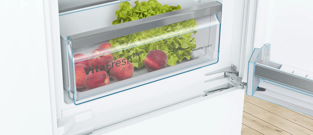 Встраиваемый двухкамерный холодильник Bosch KIS87ADD0 Этот встраиваемый агрегат сочетает лаконичный белый корпус и продуманную внутреннюю организацию, которая создана для тех, кто ценит порядок, экономичность и надежность. Серия Serie | 6 воплощает современный подход к хранению продуктов: общий полезный объем 270 л распределен так, чтобы холодильная камера занимала 208 л, а морозильная — 62 л, что обеспечивает комфортную вместимость для семьи. Инверторный компрессор и тип мотора инверторный гарантируют плавную работу и экономичное энергопотребление: годовой расход составляет 165 кВт·ч при мощности подключения 120 Вт, а уровень шума не превышает 35 дБ, благодаря чему прибор практически не мешает в повседневной жизни. Панель управления реализована электронно с удобными кнопками и информативным дисплеем, который позволяет точно задавать режимы работы. Холодильная камера оснащена системой статического охлаждения и ручным размораживанием, что способствует длительному сохранению качества продуктов при простоте обслуживания.