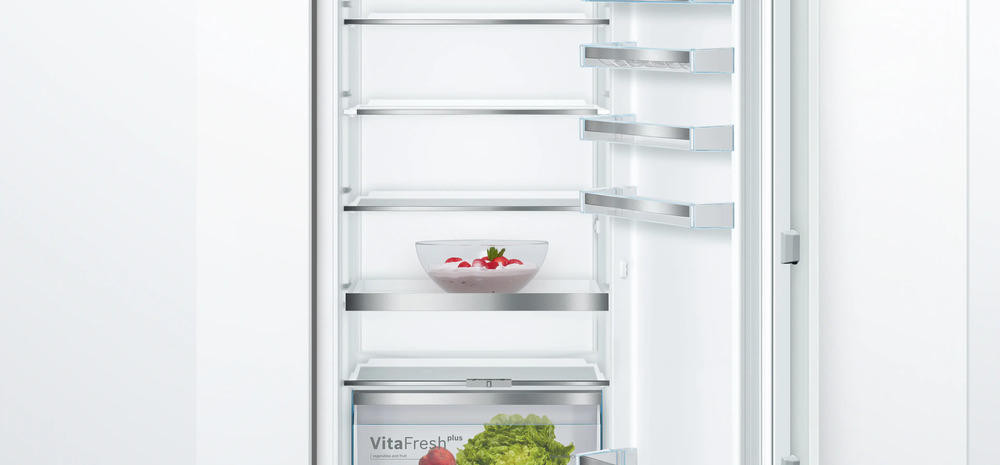 Для быстрого охлаждения продуктов предусмотрена функция суперохлаждения SuperCooling, а в морозильной камере доступна автоматическая система размораживания и технология LowFrost, сокращающая образование наледи и упрощающая уход. Мощность замораживания до 5 кг/24 ч и автономное сохранение холода в течение 12 ч обеспечивают стабильную работу при кратковременных перебоях питания, а функция SuperFreezing помогает быстро фиксировать свежесть только что закупленных продуктов. Организация внутреннего пространства направлена на удобство и гибкость: в холодильной камере расположены пять полок, из которых четыре — регулируемые и одна — фиксированная, все они выполнены из высокопрочного стекла и при необходимости легко переставляются благодаря системе VarioZone; выдвижные полки EasyAccess обеспечивают доступ к предметам, расположенным в глубине, без лишних усилий. На дверце предусмотрено пять отделений для бутылок и мелочей, есть отдельная полка для бутылок и лоток для яиц, а зона свежести VitaFresh plus позволяет хранить овощи, фрукты и мясо при оптимальной влажности и температуре, продлевая срок годности и сохраняя полезные свойства продуктов.