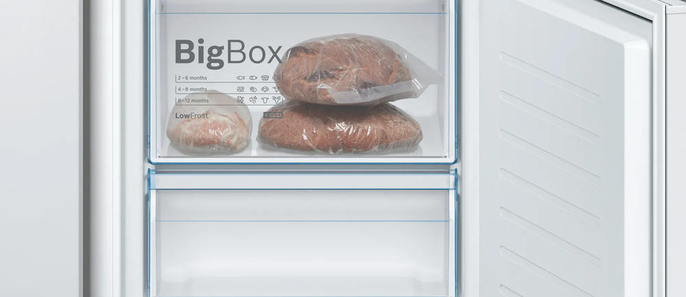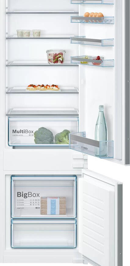 Встраиваемый двухкамерный холодильник Bosch KIV87VS30M оснащен светодиодным освещении, оно не требует постоянной замены и равномерно освещает все полки прибора. Специальные датчики FreshSense отслеживают температуру внешней среды и внутренней и исходя из этого регулируют баланс. Функция SuperFreezing поддерживает холод при добавлении новый продуктов.