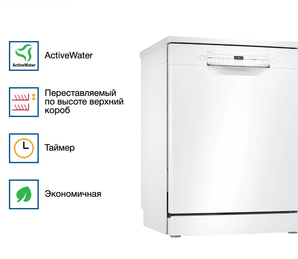 Посудомоечная машина Bosch SMS2ITW04E — отдельностоящий прибор, который выполнен в белом цвете с электронной панелью управления в виде кнопок и небольшого дисплея. Home Connect позволяет управлять устройством на расстоянии при помощи мобильного приложения. Функция ExtraDry поможет быстро высушить трудносохнущую посуду. Функция защиты стекла обеспечит бережную мойку стеклянной посуды и деликатных предметов.