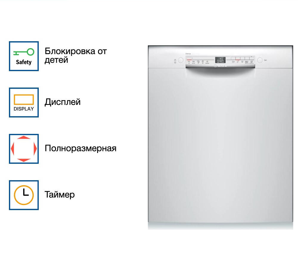 Посудомоечная машина Bosch SMU 2HVW20S — прибор с белой панелью управления. Устройство вмещает в себя 13 комплектов посуды. Таймер отсрочки представляет собой достаточно простое устройство, которое позволяет отложить начало выполнения программы на определенное время, что существенно сэкономит затраты на энергоресурсы.