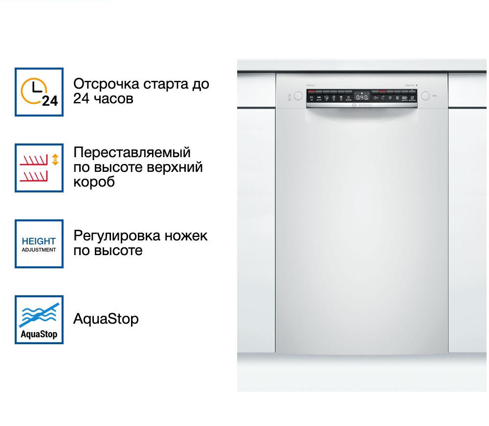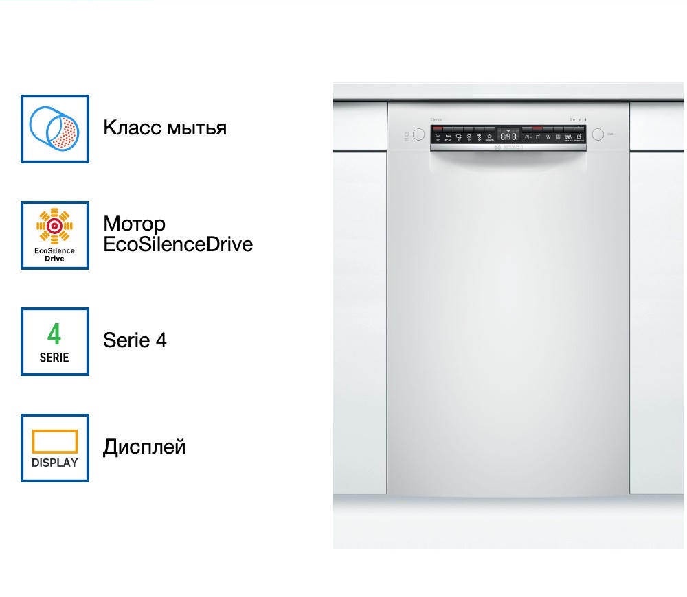 Встраиваемая посудомоечная машина Bosch SPU4HMW53S — это надежное и эффективное решение для современной кухни. Произведенная в Евросоюзе, эта модель предлагает высокое качество и долговечность, подтвержденные гарантией на 12 месяцев. Машина частично встраивается, что позволяет ей гармонично вписаться в любой интерьер, сохраняя при этом доступ к панели управления. Дизайн этой модели отличается простотой и функциональностью. Белый цвет панели управления придает ей современный и стильный вид. Управление осуществляется с помощью кнопок, а на дисплее отображается вся необходимая информация о текущем режиме работы.