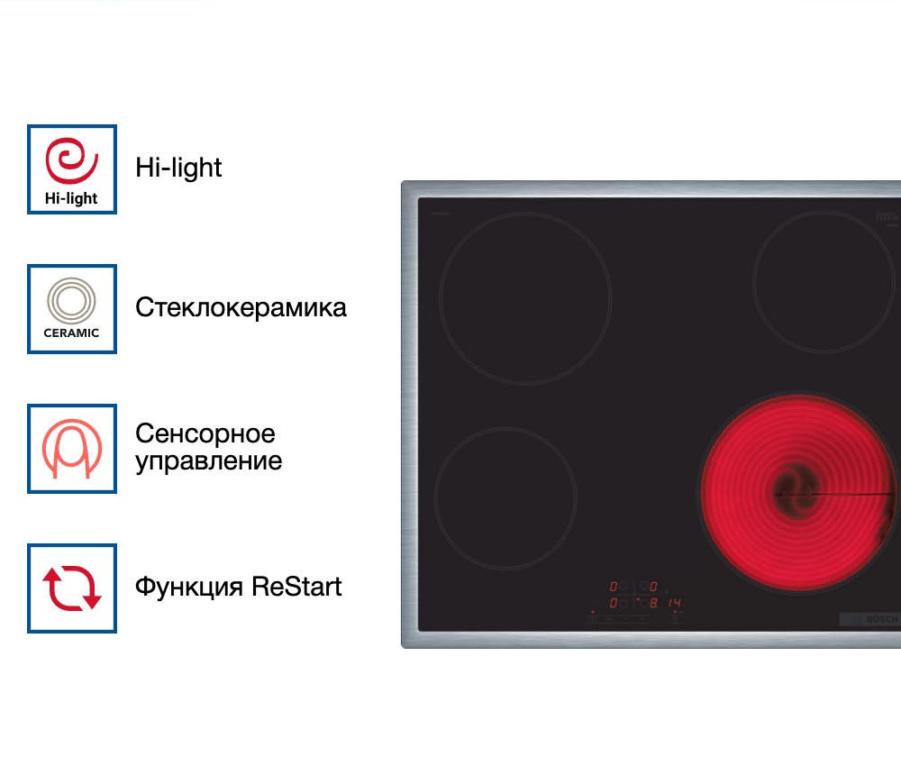 Варочная панель Bosch PKE645BB2 имеет функцию Restart, она сохраняет ваши настройки и при следующем включении восстанавливает их. Функция блокировка от детей предотвращает непреднамеренное нажатие на панель управления. С помощью индикации остаточного тепла вы всегда можете убедиться, что конфорки остыли или еще накалены.