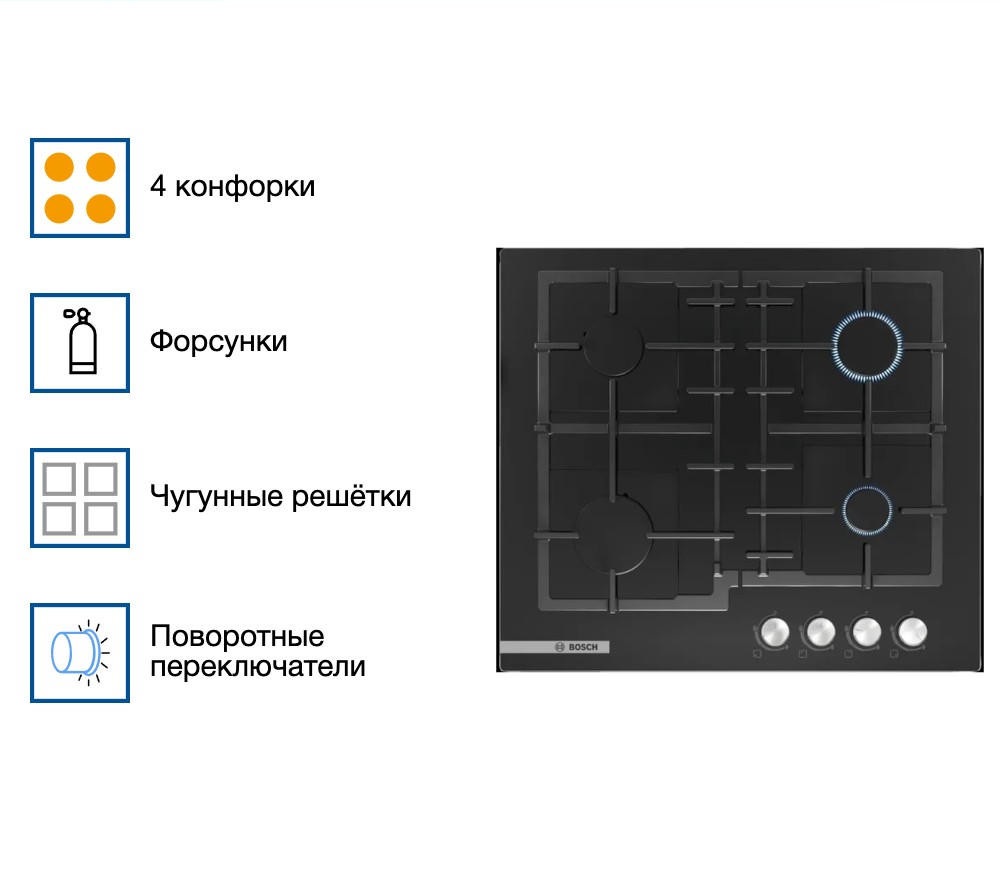 Газовая плита с переключателями, расположенными с фронта: удобство управления нужными конфорками. Варочная панель Bosch PNP6B6O93R изготовлена из закаленного стекла. Четыре мощные газовые конфорки позволяют готовить несколько блюд одновременно, а чугунные решетки обеспечат устойчивость посуды и лёгкость очистки.