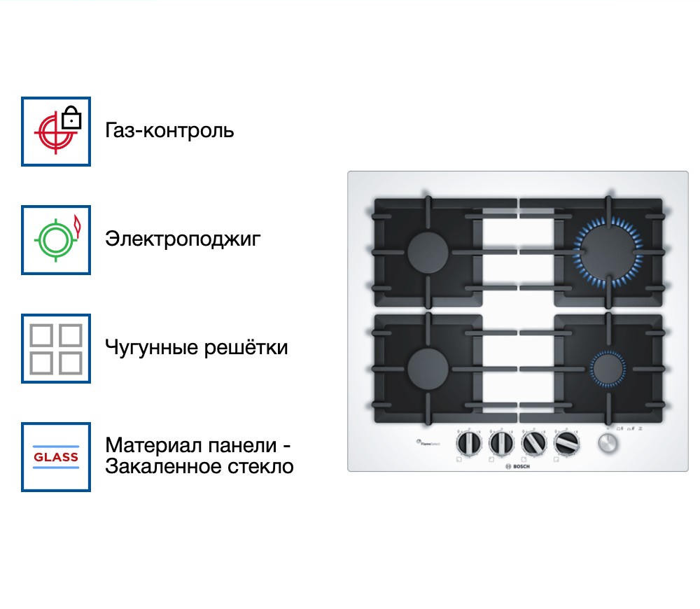 Техника укомплектована четырьмя разноразмерными горелками, активация которых осуществляется по системе автоматического электроподжига. Главный выключатель одним нажатием кнопки перекрывает подачу газа на всех конфорках. Варочную панель Бош PPP6A2M90R можно встраивать как над столешницей, так и вровень с ней. Механические фронтальные поворотные переключатели позволяют выбрать один из 9 уровней мощности пламени. Стильная раздельная чугунная решетка легко снимается, ее можно мыть под краном. В комплект входят форсунки для подключения к баллонному газу. Дополнительно можно приобрести насадку Wok и насадку для кофеварки.