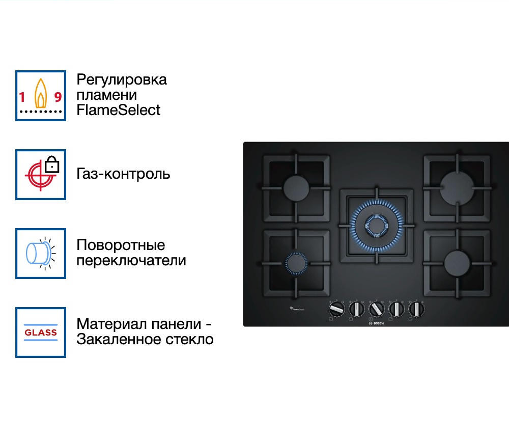Варочная панель Bosch PPQ7A6B20 — пример того, как техника может быть одновременно стильной и по-настоящему практичной. Её чёрная стеклянная поверхность с прямыми линиями выглядит аккуратно и современно, легко вписываясь и в строгую классику, и в лофт, и в скандинавский минимализм. Гладкое закалённое стекло не только радует глаз, но и упрощает уход — достаточно протереть после готовки, и кухня снова выглядит безупречно.