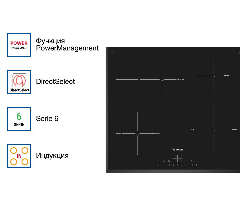 Варочная поверхность Bosch PIF651FC1E — это сочетание высоких технологий, элегантного дизайна и надежности. Произведенная в Евросоюзе, она обладает гарантией в 12 месяцев, что подтверждает ее высокое качество. Элегантная черная стеклокерамическая поверхность с скошенным краем не только выглядит стильно, но и обеспечивает удобство в использовании. Сенсорные элементы управления с системой DirectSelect позволяют легко и быстро выбрать необходимую мощность и время приготовления.
