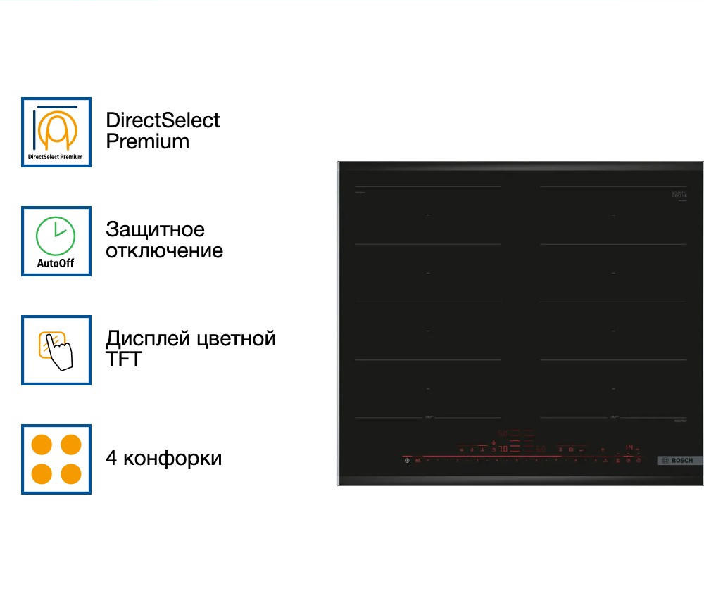 Управление реализовано через систему DirectSelect Premium с сенсорными кнопками и информативным LCD-дисплеем. Пользователь может выбрать одну из 17 ступеней мощности для каждой конфорки и точно настроить процесс готовки. Таймер прямого отсчёта помогает соблюдать временные рамки, а индивидуальное отключение зон повышает безопасность и удобство эксплуатации.