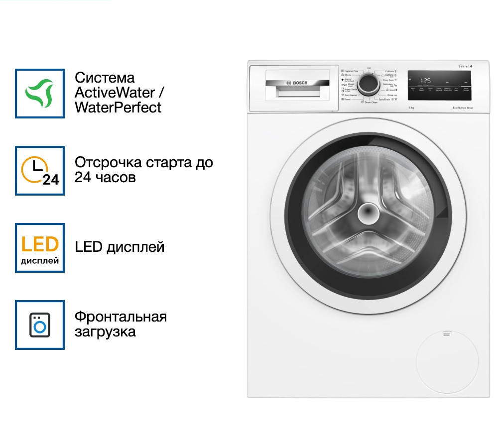 Барабан рассчитан на загрузку до 8 кг, что оптимально для семьи из 3-4 человек. Фронтальная загрузка обеспечивает удобство при закладке и извлечении вещей. За бесшумную и плавную работу отвечает инверторный мотор EcoSilenceDrive — он не только снижает уровень шума, но и увеличивает срок службы техники. Управление осуществляется через интуитивно понятную электронную панель с поворотным селектором и сенсорными элементами. Информативный LED-дисплей отображает текущий этап цикла, оставшееся время, рекомендованную загрузку и данные о работе системы SmartEcoControl, отвечающей за энергоэффективность.