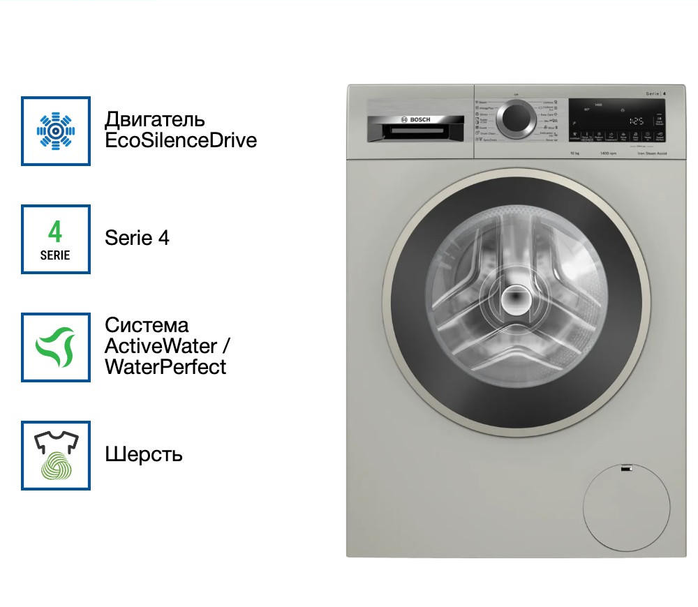Устройство имеет привлекательный современный дизайн с белым корпусом и удобным многофункциональным LED-дисплеем. Эргономичные кнопки управления и интуитивно понятные индикаторы делают процесс стирки максимально простым и комфортным. Модель относится к серии Serie 4 и представляет собой отдельностоящую машину с фронтальной загрузкой.
