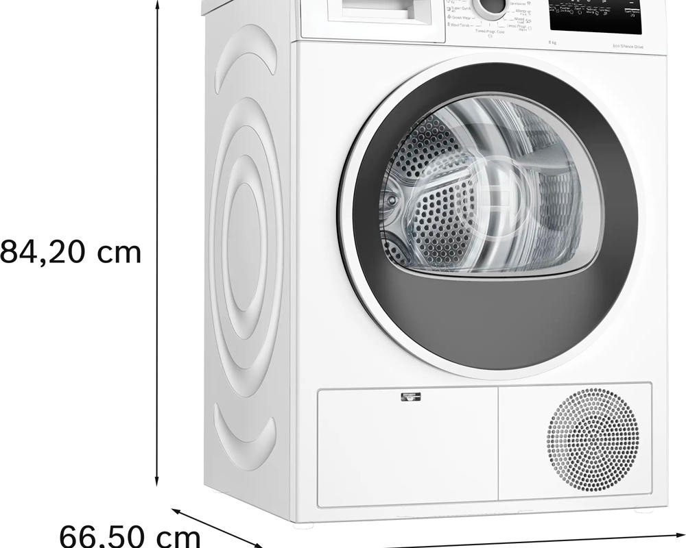 Сушильная машина Bosch WTN86211ME из серии Serie | 4 представляет собой идеальное решение для тех, кто ценит качество, надежность и современный дизайн бытовой техники. Устройство выполнено в классическом белом цвете, который гармонично впишется в любой интерьер, а компактные размеры — 84,2 см в высоту, 59,8 см в ширину и 66,5 см в глубину — позволяют разместить прибор даже в ограниченном пространстве. Особое внимание уделено конструкции боковых панелей с технологией AntiVibration, которая снижает уровень вибраций и шума во время работы, обеспечивая комфортное использование в домашних условиях.
